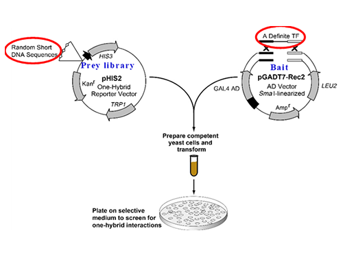 在该系统中,首先构建随机DNA文库,再利用酵母单杂交技术筛选文库鉴定转录因子特异性结合的DNA序列。研究的转录因子作为 Bait,随机的短的 DNA 序列文库克隆到pHIS2载体中作为Prey,一个元件序列足够与TF结合。