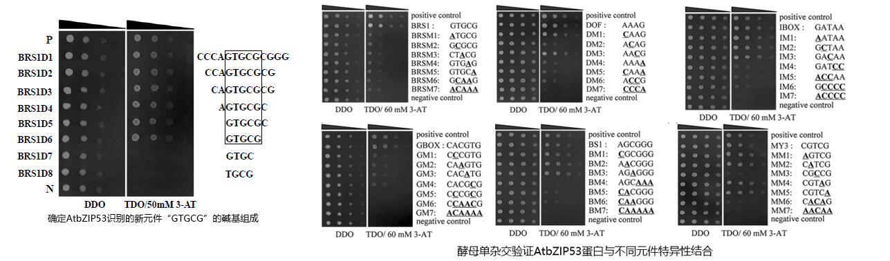 bZIP转录因子是一类重要的植物转录因子,在植物的生长过程中发挥着重要的作用。迄今为止,只有少数bZIP家族成员被研究,且发现它们主要结合核心序列为“ACGT”的顺式作用元件。然而,它是否识别其他顺式作用元件,进而发挥相应的生物学功能,尚不清楚,所以我们选择bZIP53筛选随机DNA文库,共获得一个未知元件和5个已知的DNA序列。