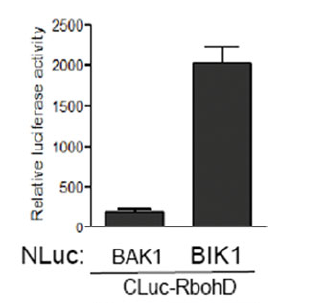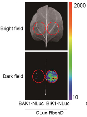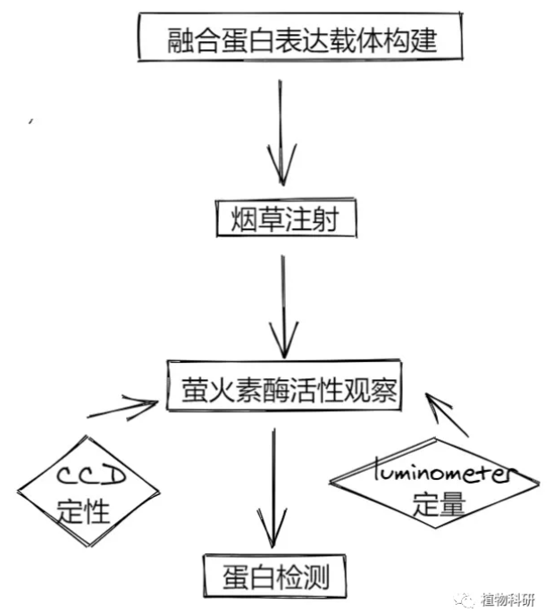 原理:以萤火素(luciferin)为底物来检测萤火素酶(luciferase)的活性。在实验中, 萤火素酶蛋白被切成 N 端和 C 端 2 个功能片段, 即 NLuc(2–416aa)和 CLuc (398–550 aa),并分别连接在两个载体 pCAMBIA-1300-NLuc (pNL)和 pCAMBIA1300-CLuc (pCL)上。实验中, 待测的 2 个目标蛋白的编码序列分别连在两个载体上,将目标基因与报告基因融合, 获得含有目标基因的重组质粒。如果 2 个目标蛋白发生相互作用,萤火素酶的 NLuc 和 CLuc 就会在空间上足够靠近, 从而发挥萤火素酶活性,分解萤火素底物并产生荧光。